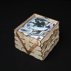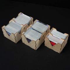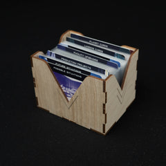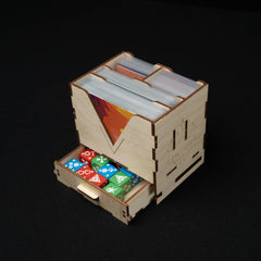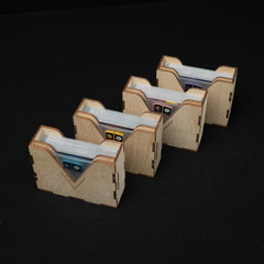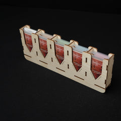 Transform your ISS Vanguard experience with the meticulously crafted, wooden organizer, designed to seamlessly replace the original A and B plastic inserts. This elegant, laser-cut marvel not only accommodates sleeved cards with precision through its series of card holders but also captivates with a striking four-storey token holder tower. Adorned with thematic artwork, it organizes tokens, dice, and enemies into an impressive display, enhancing both setup and gameplay with its blend of functionality and aesthetic charm.