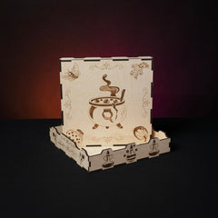 To store all your potionmaking equipment in a stylish way, we designed the Quacks Big Box, a beautifully designed wooden crate that is compatible with our game organizer, thus giving a new home for the game and its several expansions.