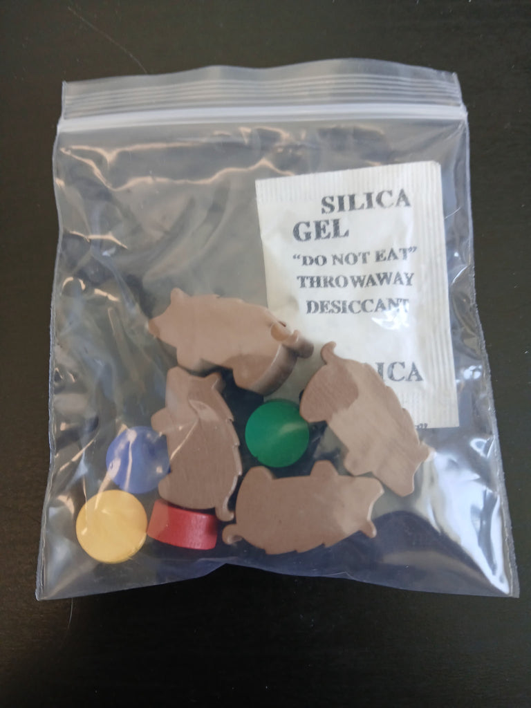 4 boar tokens and 1 red, 1 green, 1 yellow and 1 blue disc.