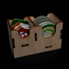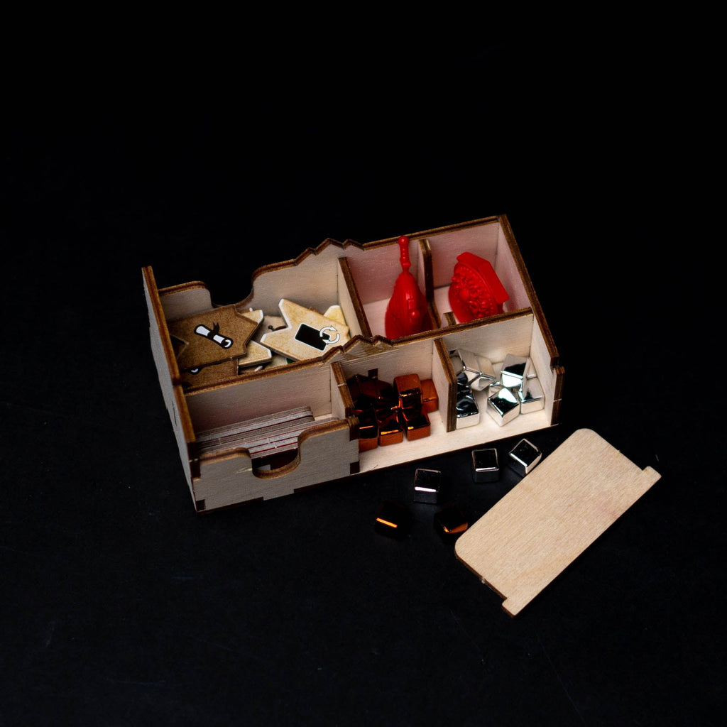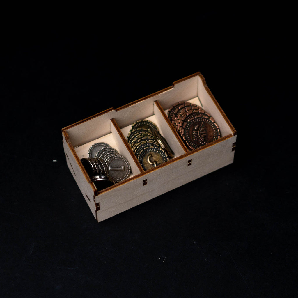 The coin tray has the value engraved and also holds the metal coins if you own them. Fits FFG sleeved cards and the box will close flush.