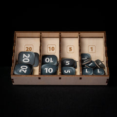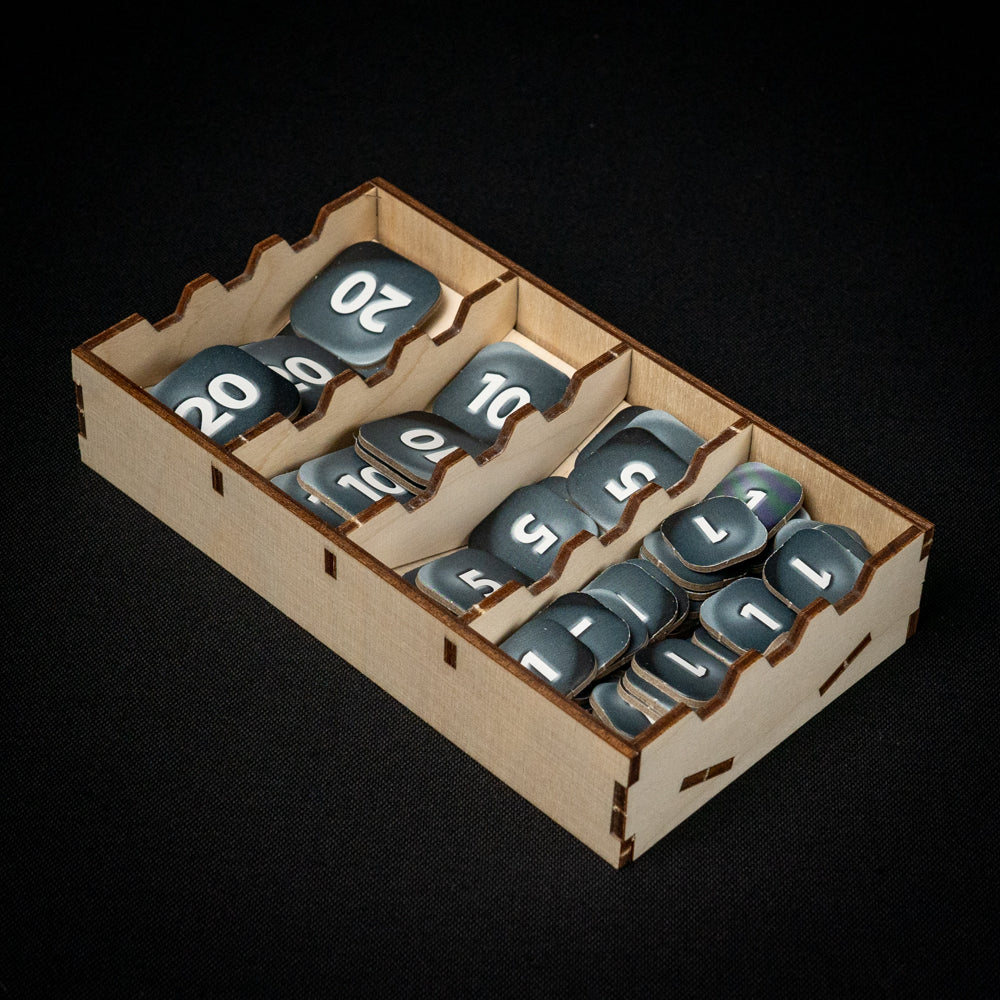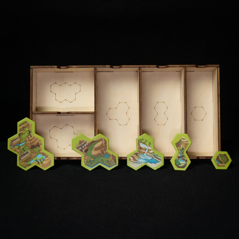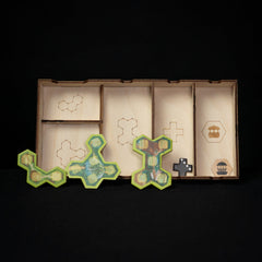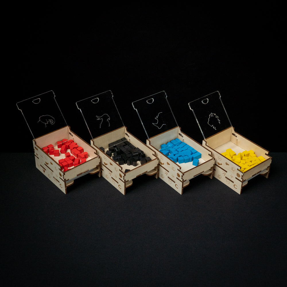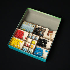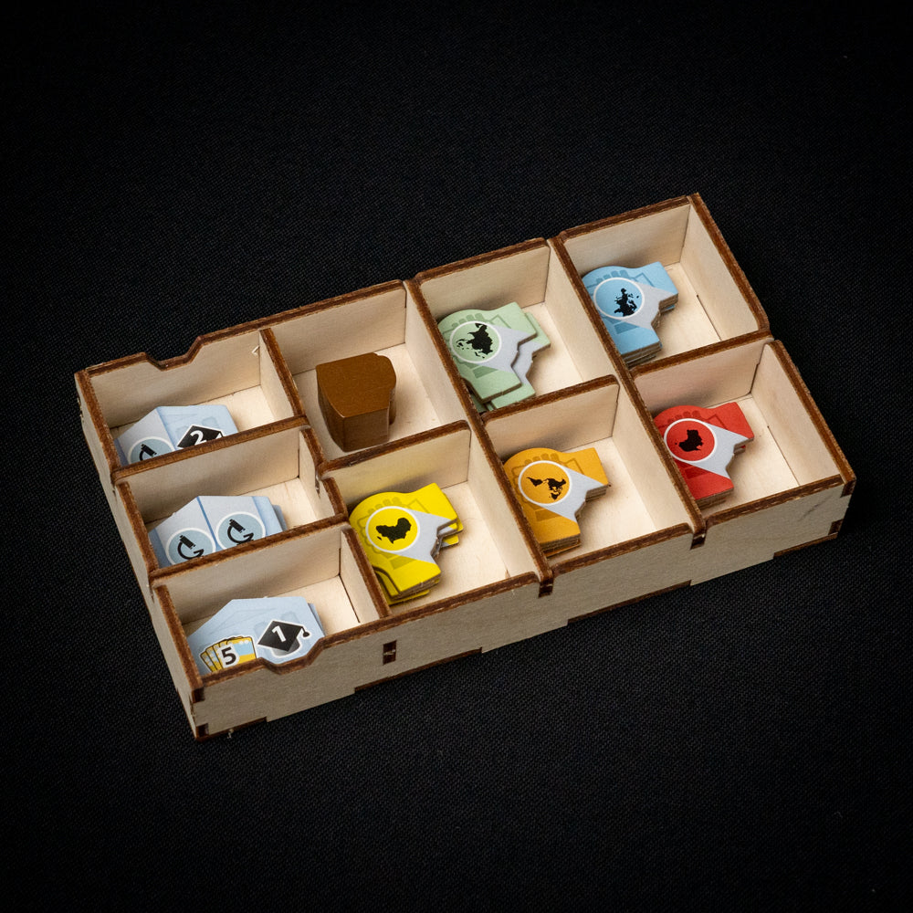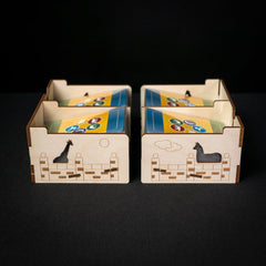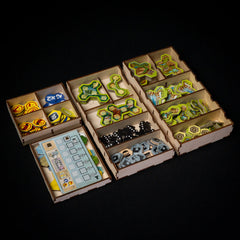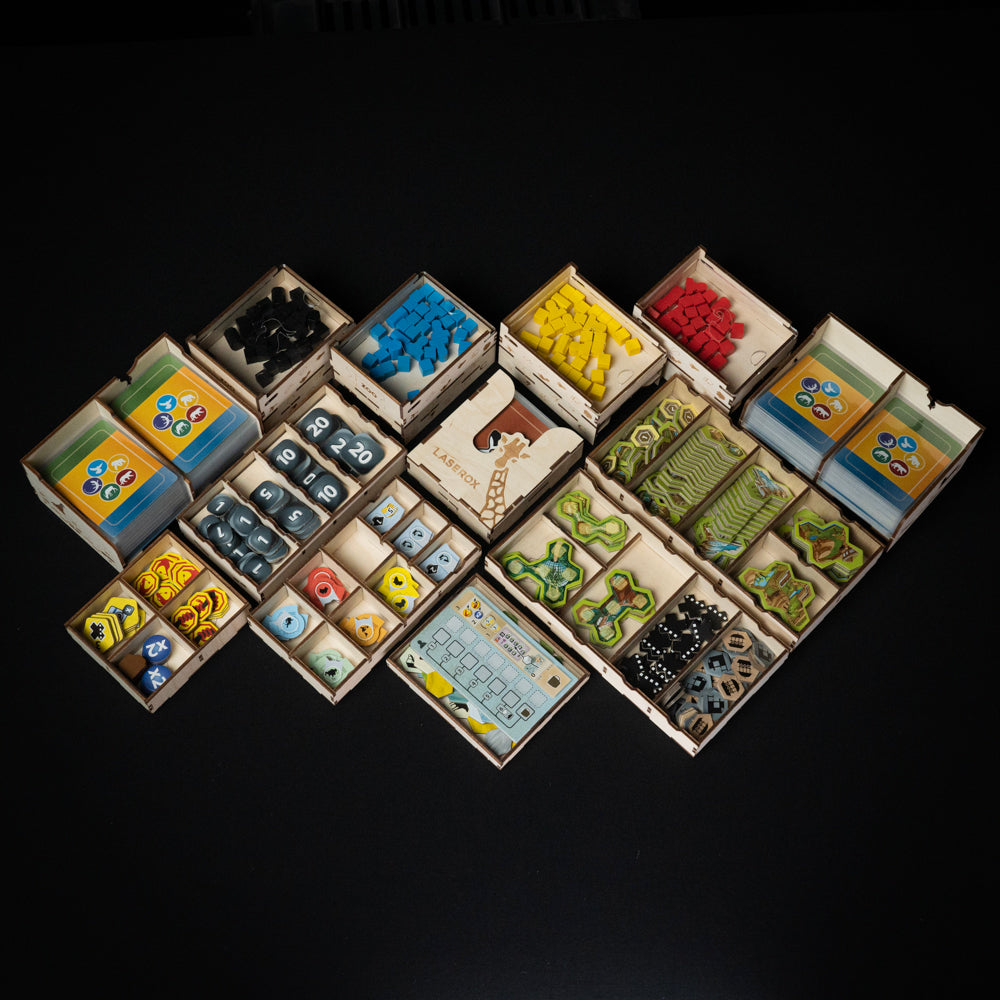 Try your hand at designing and running a modern zoo in Ark Nova. Your goal is twofold: on the one hand, you need to make your zoo appealing to visitors by presenting some majestic and unique animals and thus funding your revenues. On the other hand, you also need to be an active participant in various nature conservation projects. You will do this by cleverly using your five action cards as their strength vary from turn to turn. Whoever is quickest at creating the most balanced zoo, wins the game. With the Ark Organizer, you can give your game a nice, compact storage system that can significantly speed up the setup and cleanup time, so that more time remains to the best part, building your zoo, which can be quite lengthy anyways. The storage elements are easy to handle and can also be used during gameplay, relieving your gaming table of scattered components and taking further the zoo theme with the decorations on the boxes.