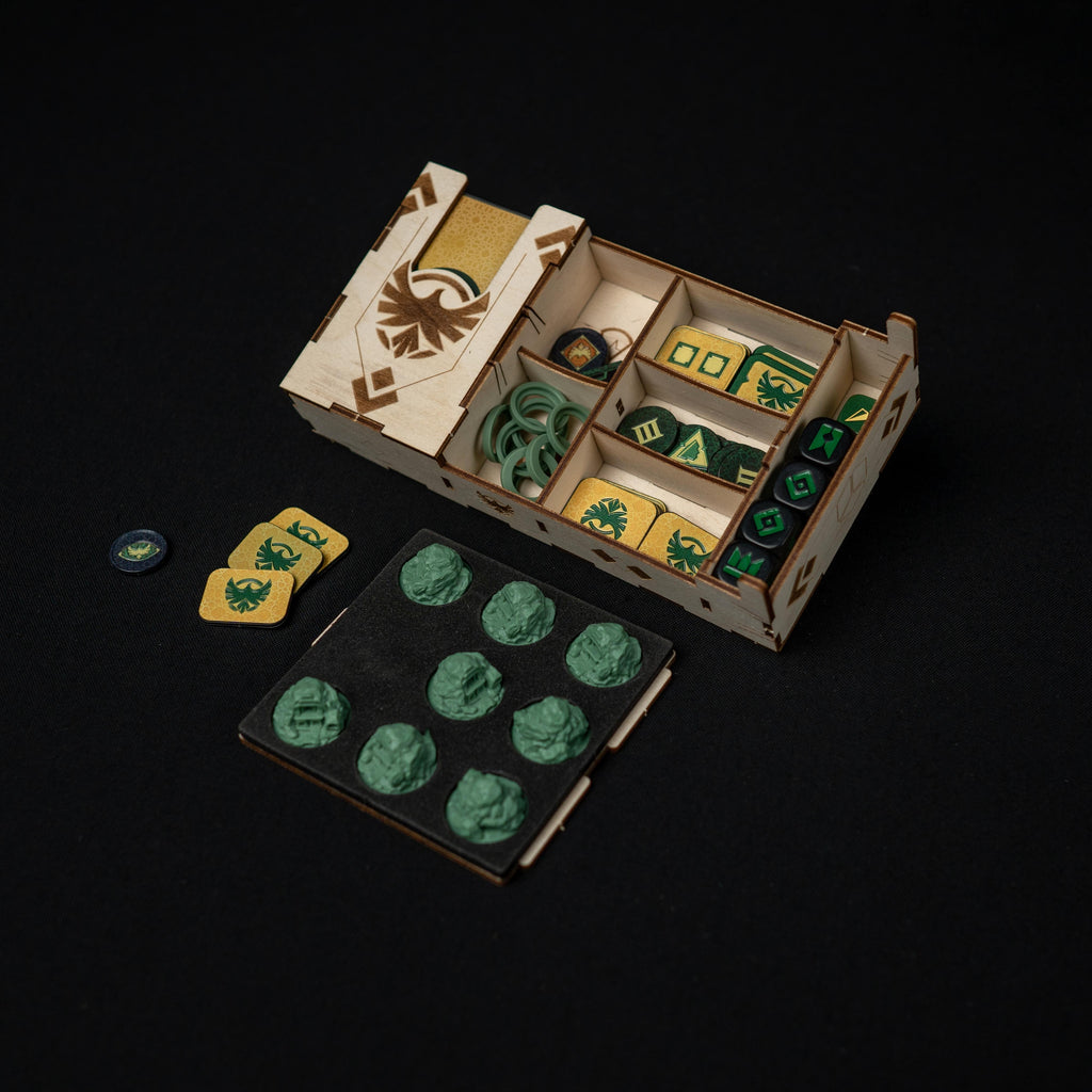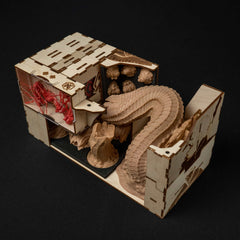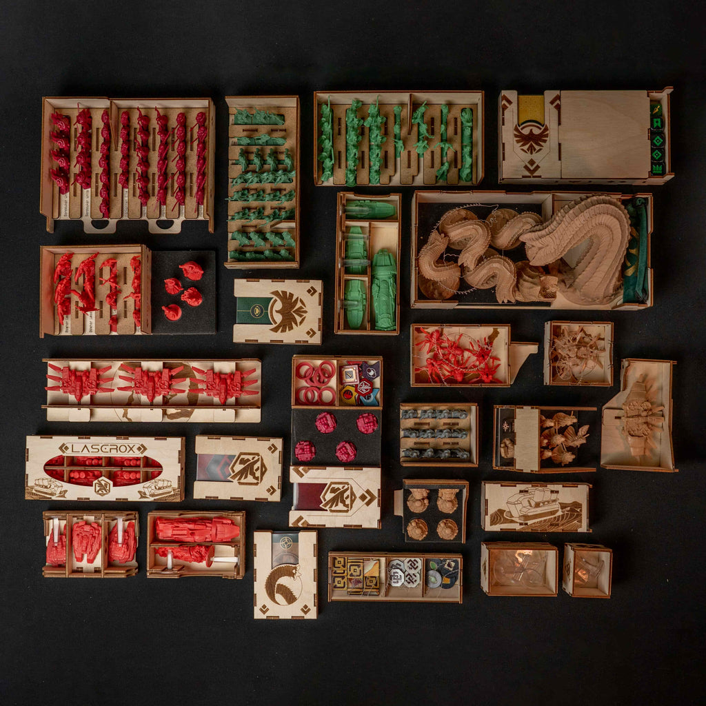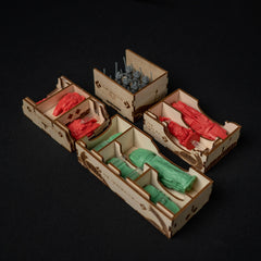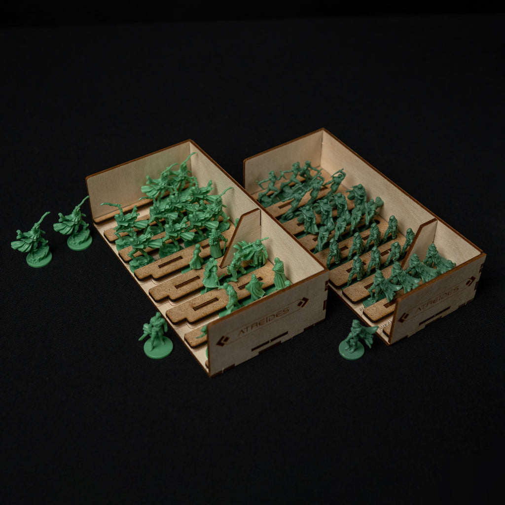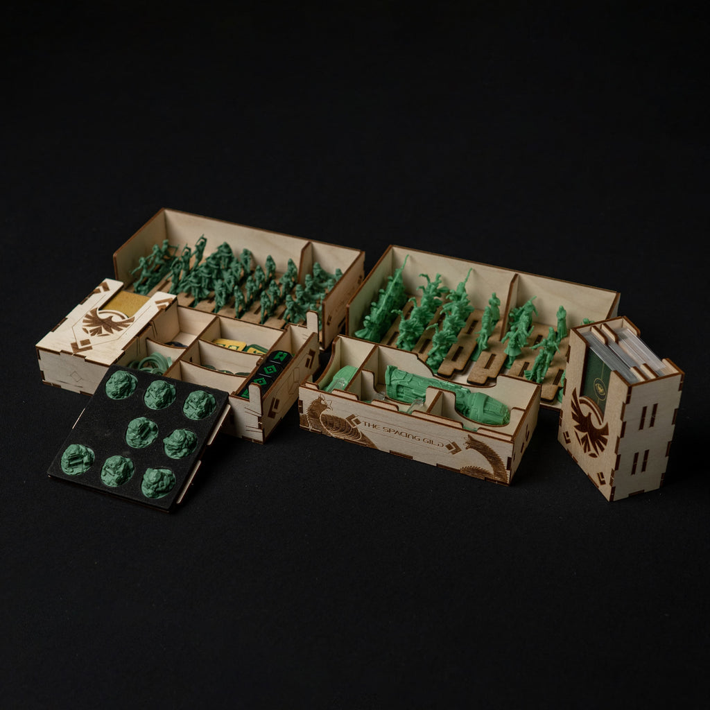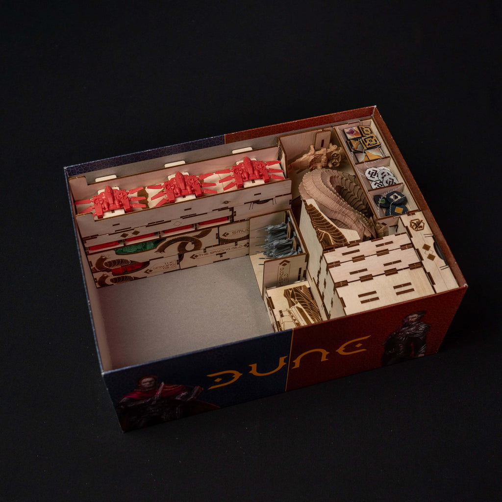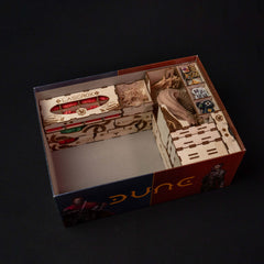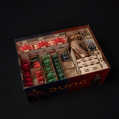 Enhance your Dune: War for Arrakis experience with a stunning organizer that brings order to the chaos of the desert world. Featuring intricately engraved wooden holders and acrylic box lids adorned with thematic details, it neatly stores all game components, including miniatures and two expansions, while evoking the vast sands of Arrakis. With swift setup and seamless gameplay, this organizer ensures you're ready for battle in the blink of an eye, leaving you fully immersed in the struggle for Spice.