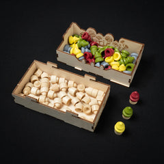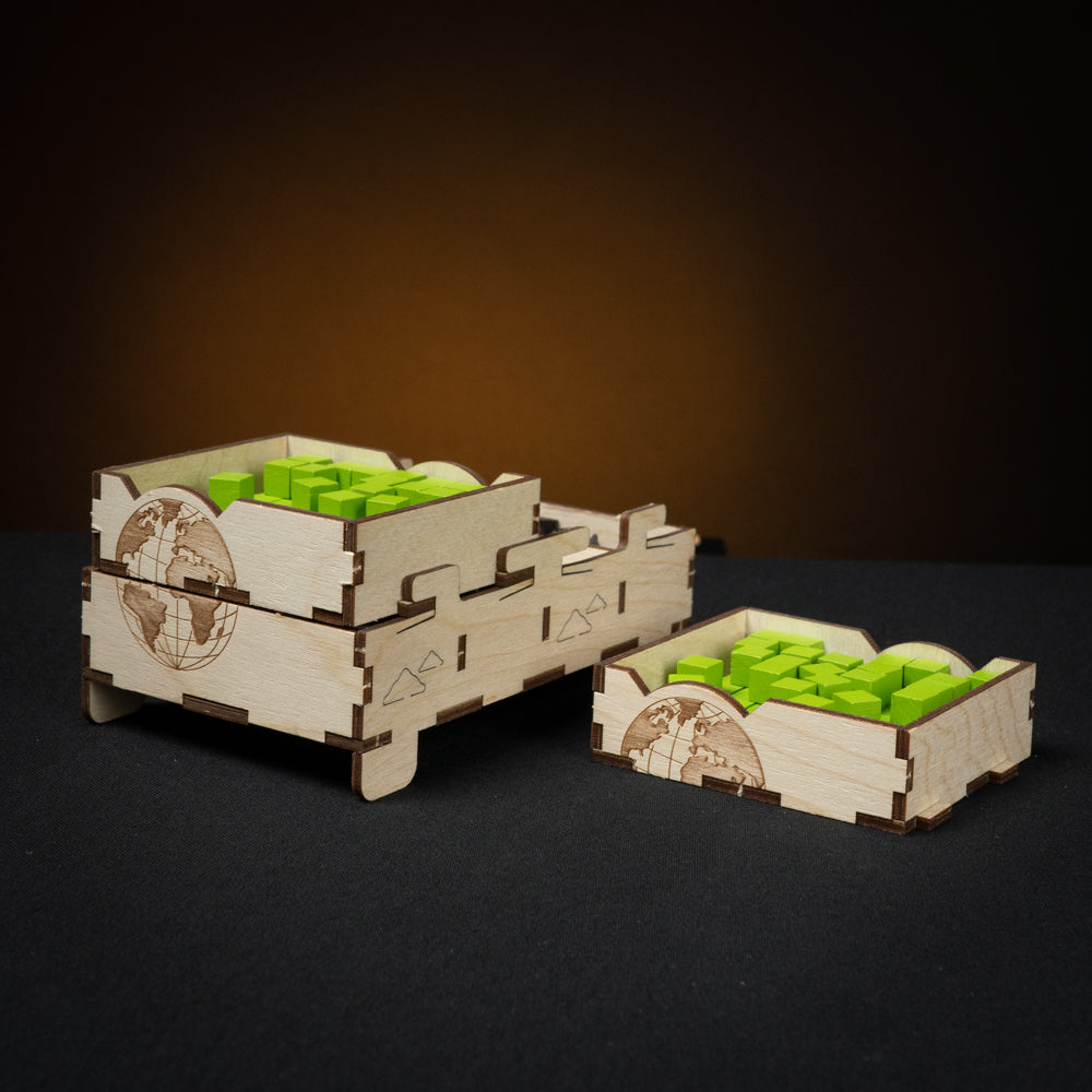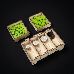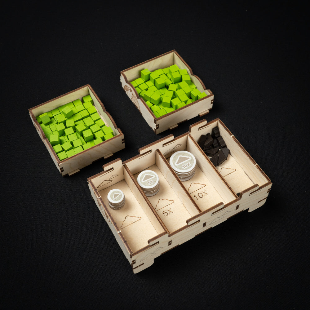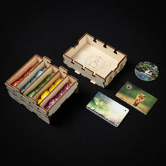 To help you in building your ecosystem and maintain its balance, we created the Earth Organizer. It keeps all game components in order within the gamebox and will make your setup and gameplay much smoother. The labelled card holder helps you to easily find the needed cards to kickstart your board for the game and create the vast stack of in-play cards . The organizer also features numerous card and token trays so that all players can keep some in easy reach.