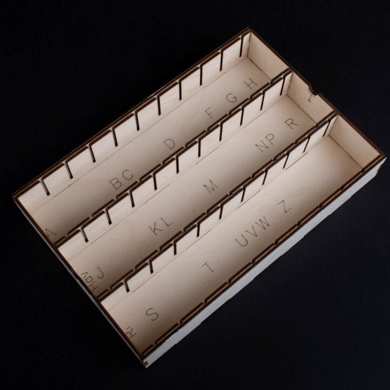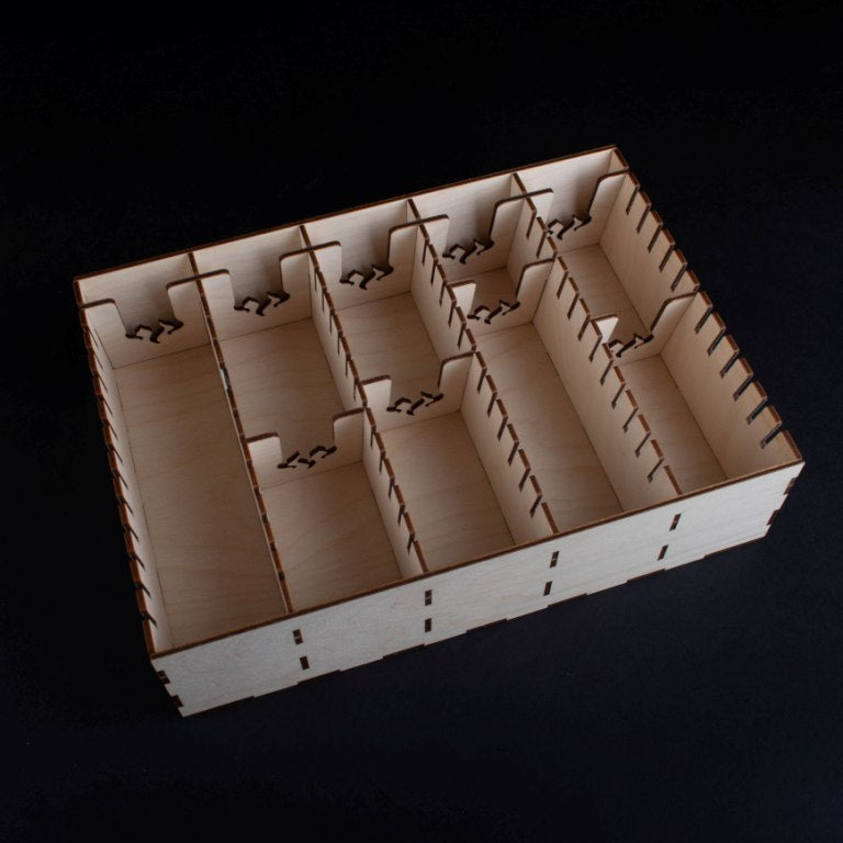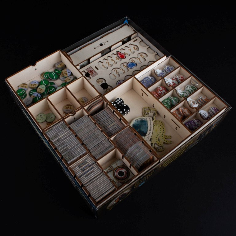 Across the globe, ancient evil is stirring. Now, you and your trusted circle of colleagues must travel around the world, working against all odds to hold back the approaching horror. This organizer was designed to hold Eldritch Horror™ by Fantasy Flight Games™ and all available expansions in four original game boxes. It features various card trays, token trays for quick setup and easy access during game.