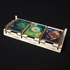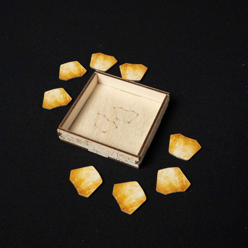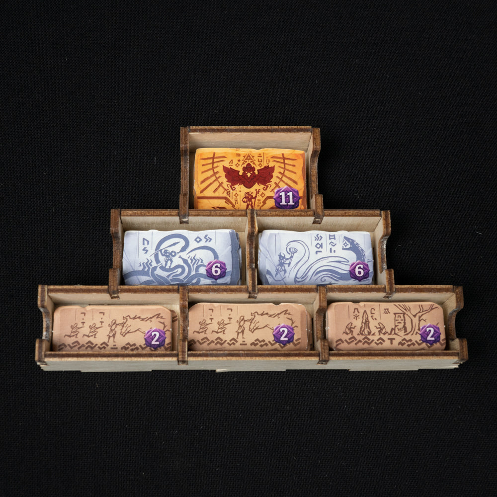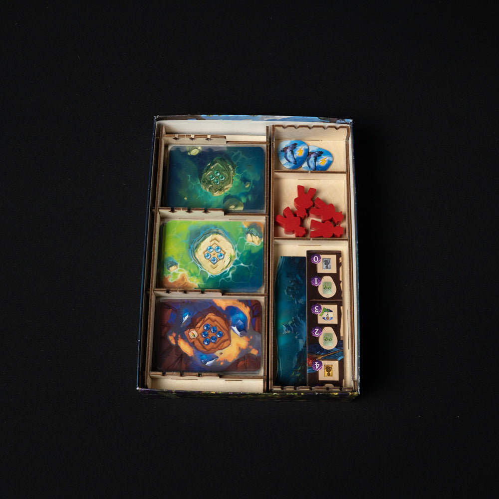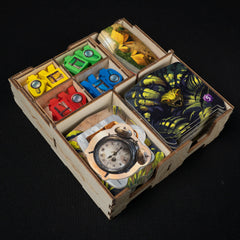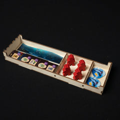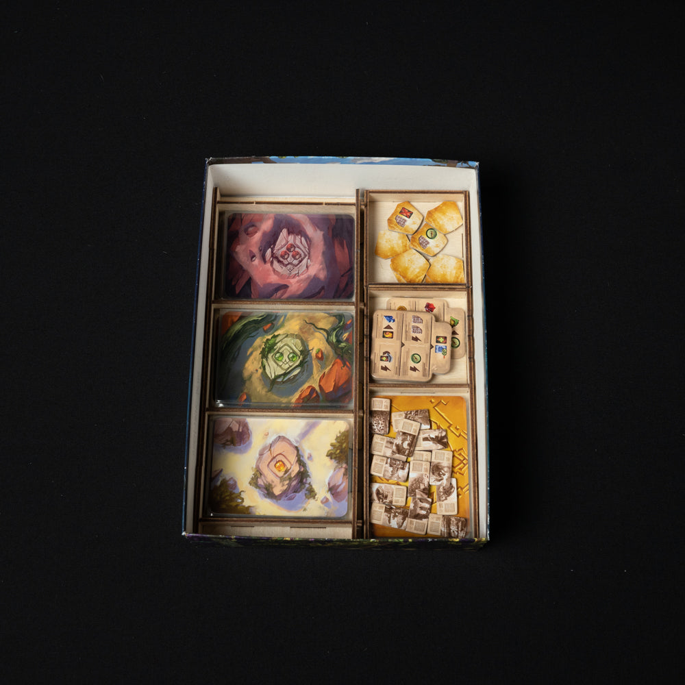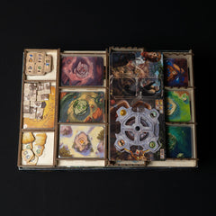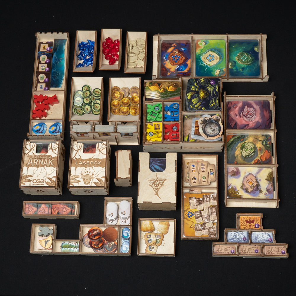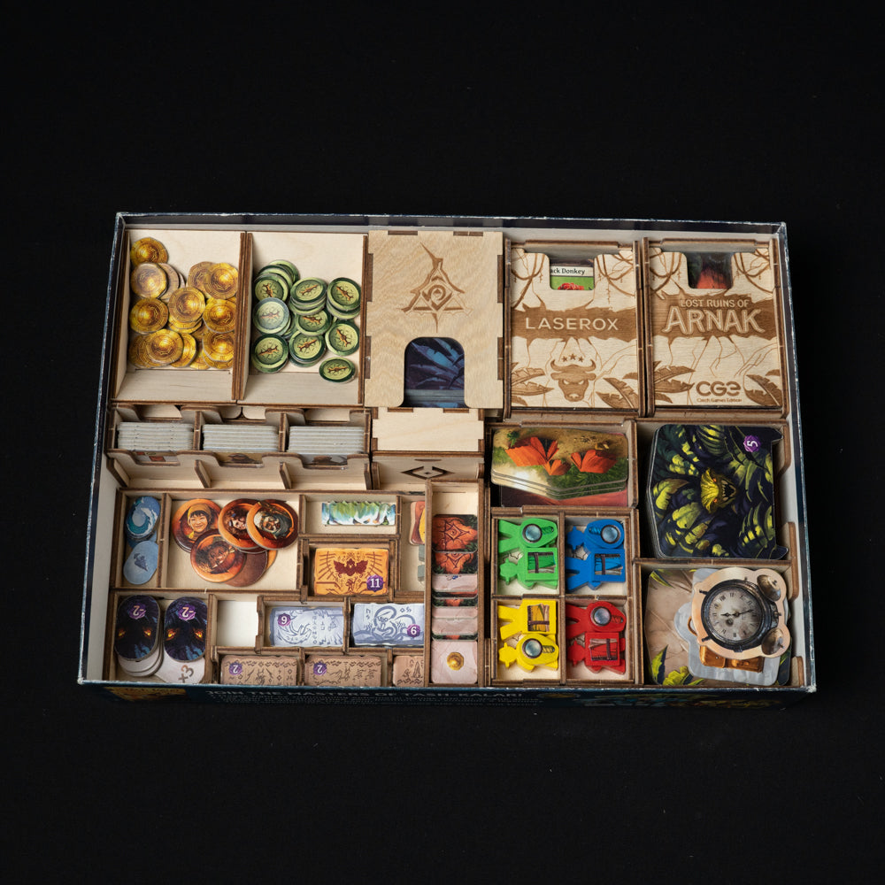 Embark on a thrilling expedition to the Lost Ruins of Arnak, an island shrouded in mystery and guarded by ancient secrets. This game invites explorers to uncover artifacts, face formidable guardians, and unveil the island's hidden truths. With a blend of traditional deck-building mechanics and strategic worker placement, players must carefully choose actions, manage resources, and adapt to the ever-changing challenges of this enigmatic realm. To help you with your expedition, we have created an organizer that makes setting up the game faster and easier, with specially designed compartments to be used during the game. The big game box stores all there is to the base game and the Expedition Leaders Expansion, while the Missing Expedition expansion can either be stored in its own box or stacked on top of the rest of the game components – in the latter case, please count with 3 cm lid-lift.