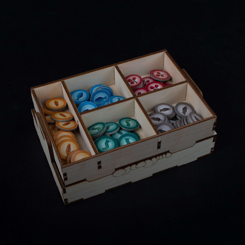 Birds, birds, birds everywhere. In various colors and shapes forming the wonderful game of Wingspan. We designed this organizer to hold the base game and future expansion in one box and make setup and gameplay as smooth as possible.